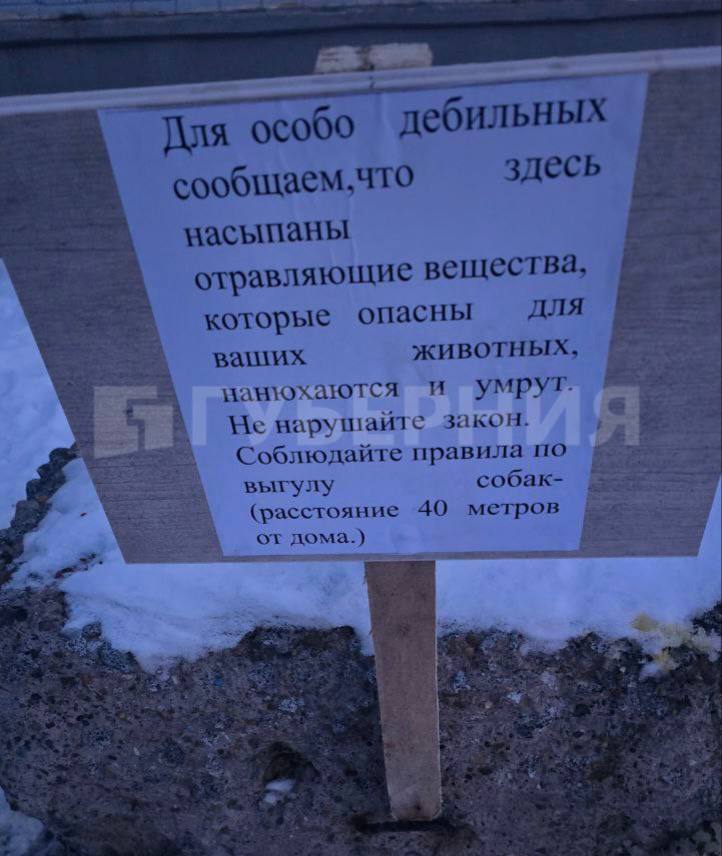 Вчера жильцы дома на улице Брестской увидели на придомовой территории табличку с информацией о разбросанных здесь отравляющих веществах, которые опасны для животных – «нанюхаются и умрут». Далее же «особо дебильным» наказано соблюдать правила по выгулу собак.