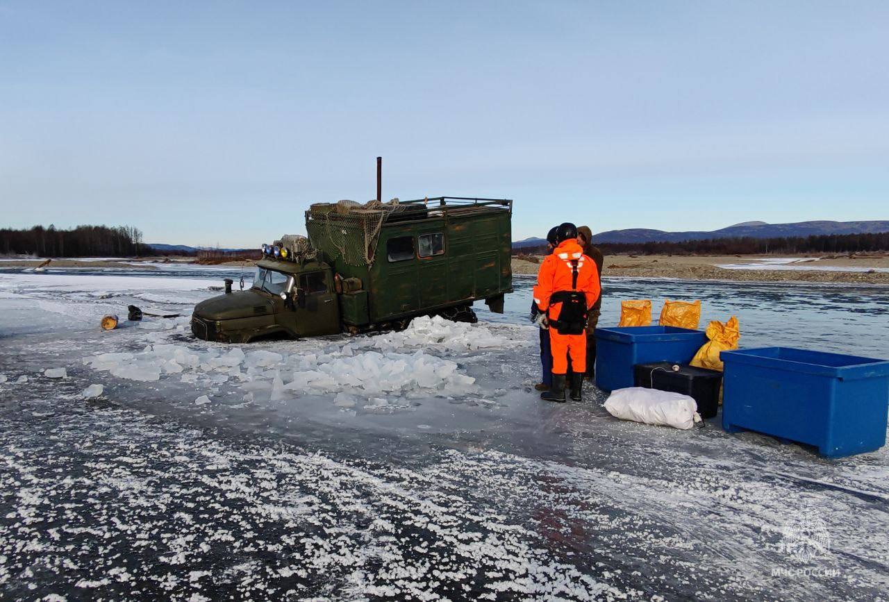 Мужчины возвращались с рыбалки на реке Яна в Ольском муниципальном округе. Когда они пересекали реку, у автомобиля загорелся двигатель. Пламя удалось потушить, но двигаться дальше рыбаки не смогли и решили обратиться к спасателям.