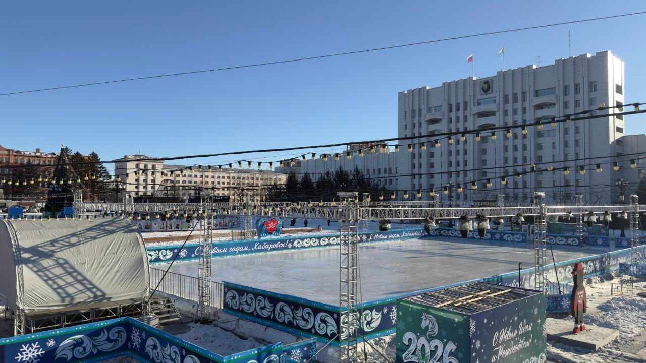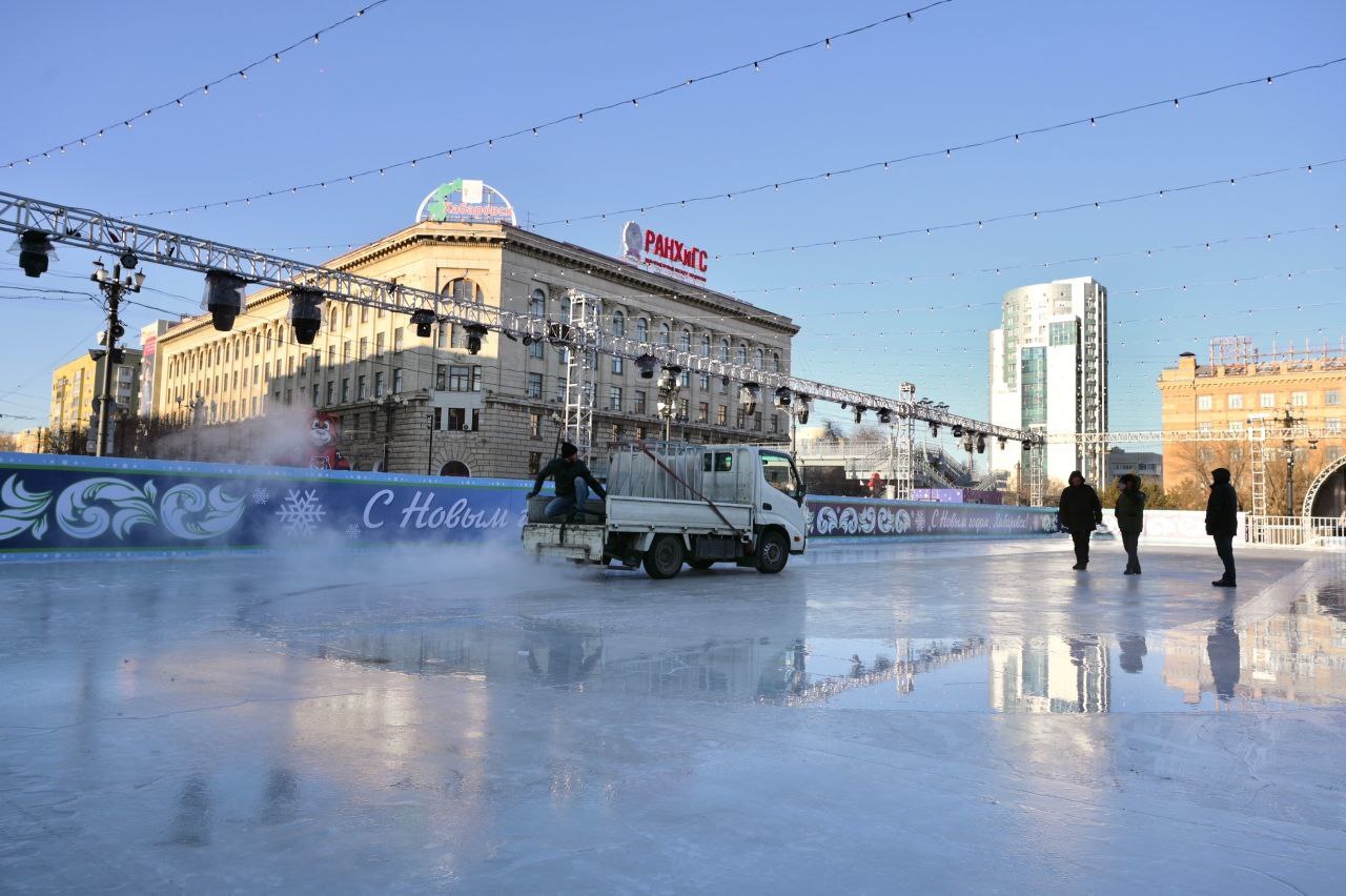 Чуть меньше суток остается до открытия катка на главной площади Хабаровска. Сегодня на ледовом поле завершается шлифовочная заливка.