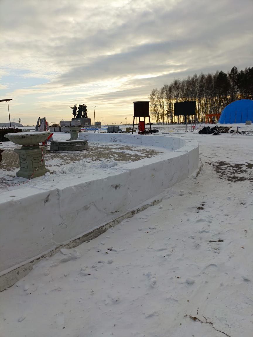 Специалисты начали подготовку площадки для нового катка около сцены. Сейчас активно формируют снежные ограждения вокруг фонтана. После завершения монтажа начнется заполнение водой как самих ограждений, так и основной поверхности катка.