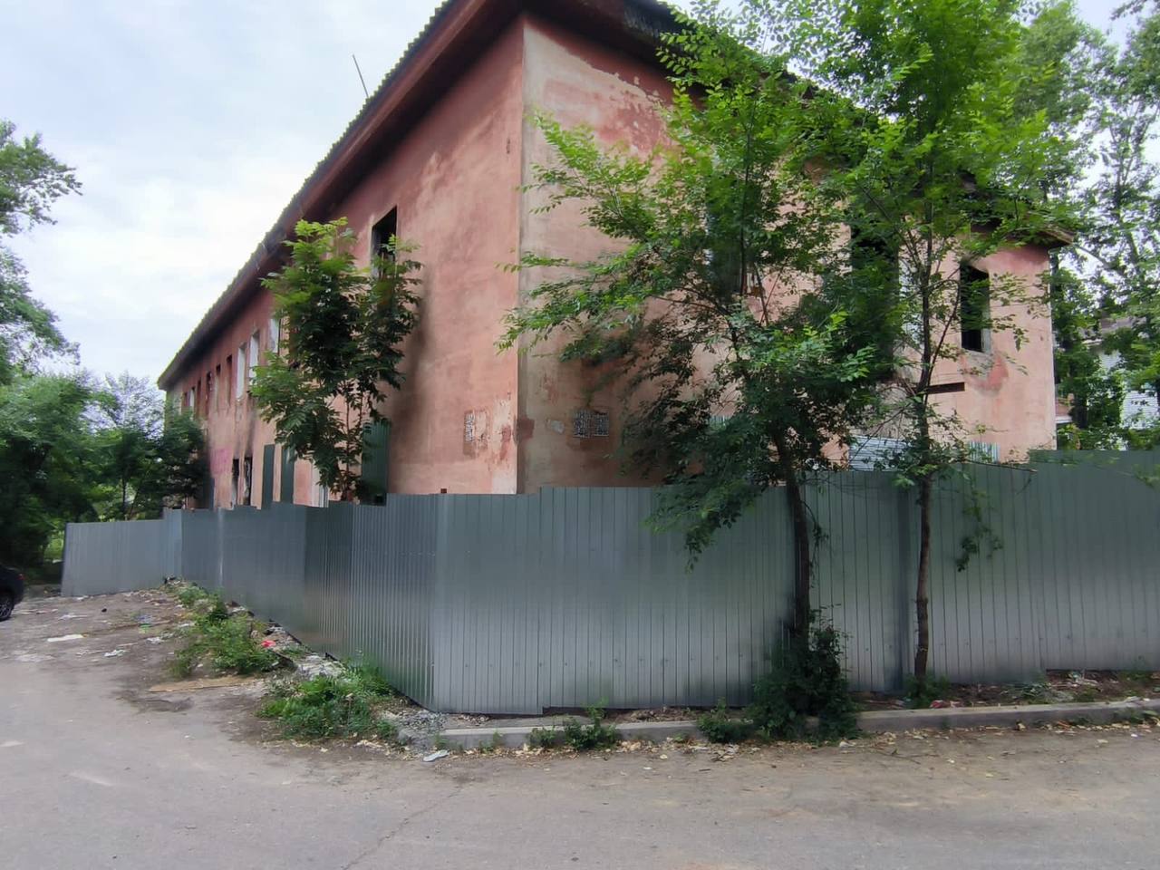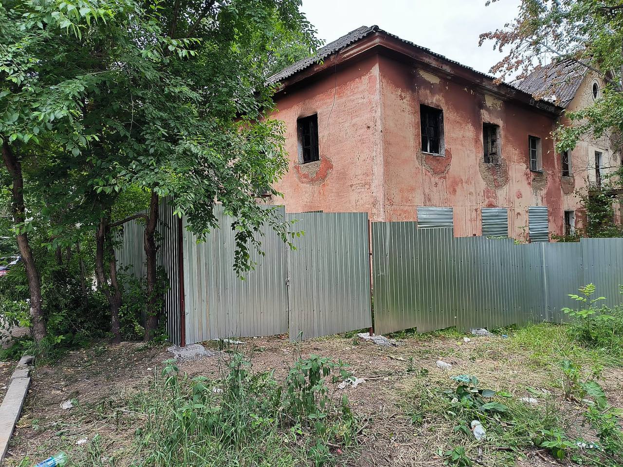 Оградить объект потребовал прокурор Краснофлотского района. Администрация города исполнила решение суда и возвела вокруг здания высокий металлический забор. Оконные и дверные проемы также были закрыты профильными листами.