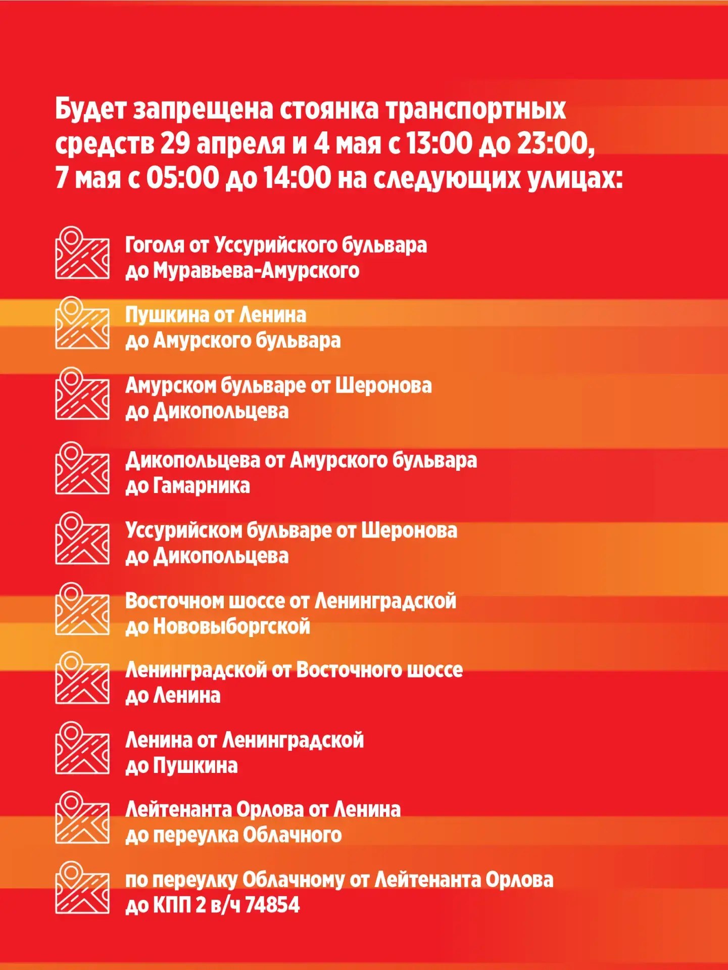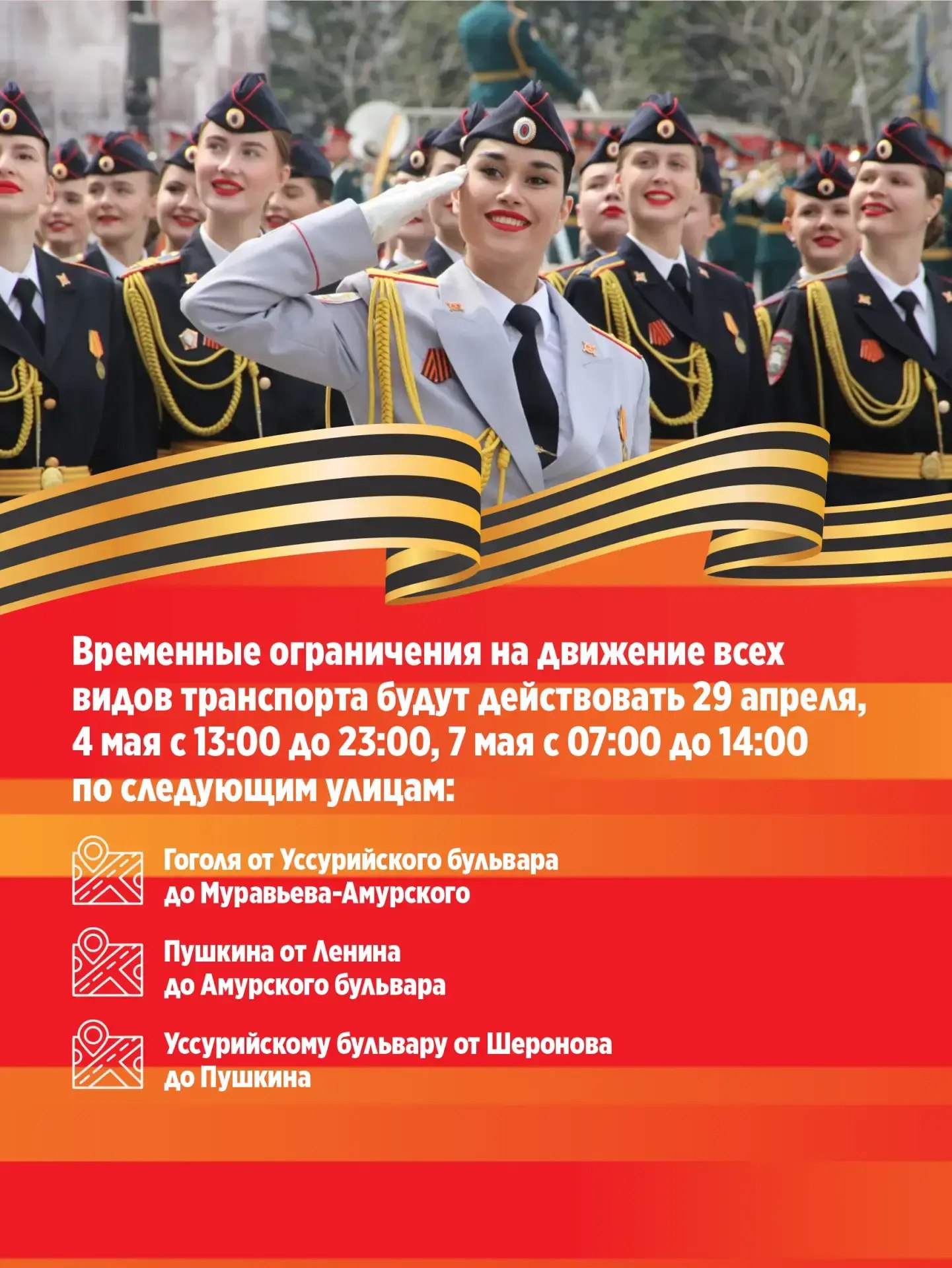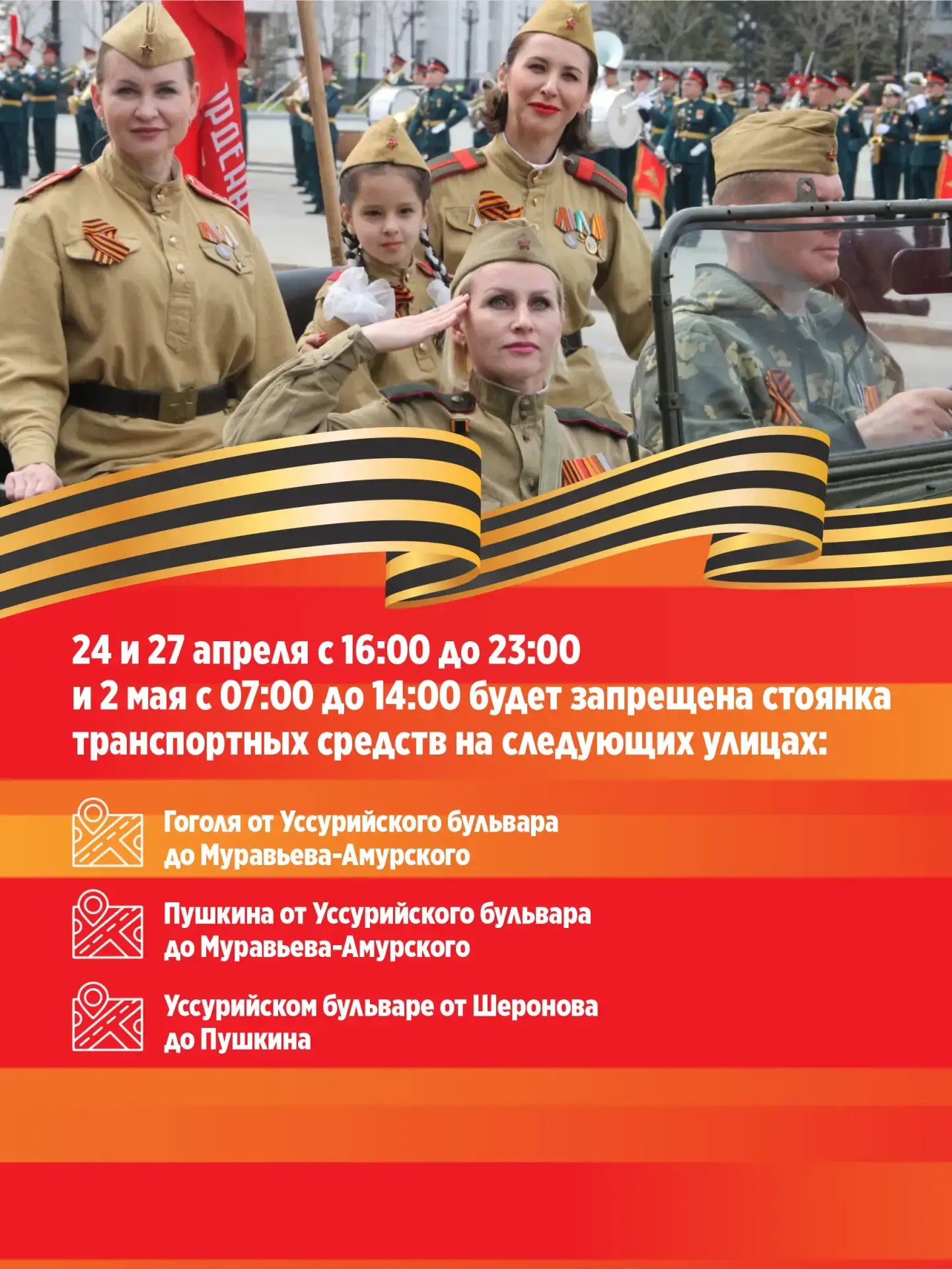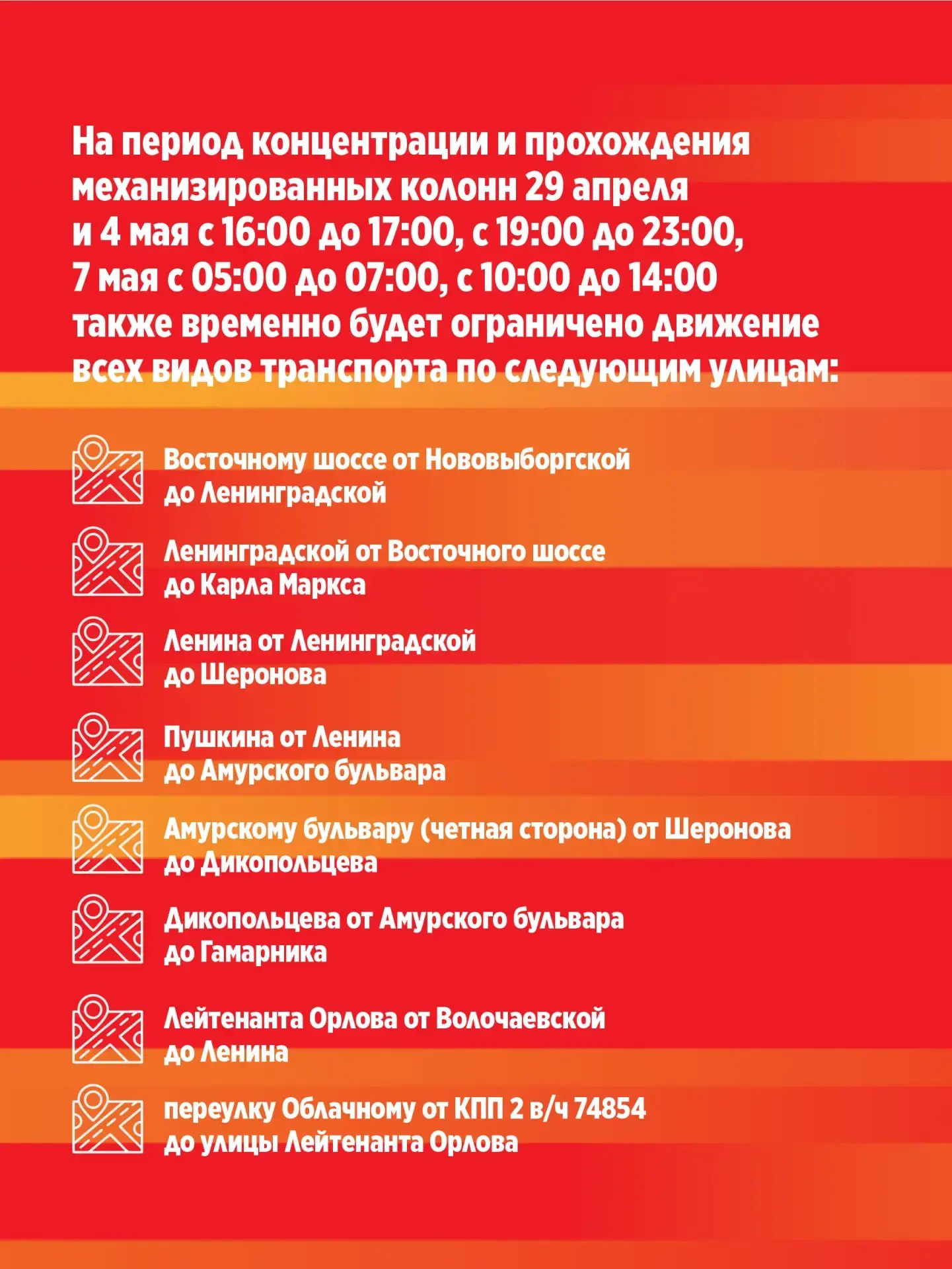 Пешие репетиции парада пройдут 24 и 27 апреля, а также 2 мая. Репетиции с привлечением техники запланированы 29 апреля и 4 мая. Генеральная репетиция состоится 7 мая.
