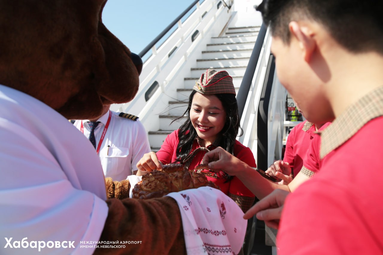 Экипаж самолета встретил фирменный персонаж нашего аэропорта Мишка, он угостил гостей хлебом с солью. А на регистрации пассажиры первого рейса получили памятные открытки.
